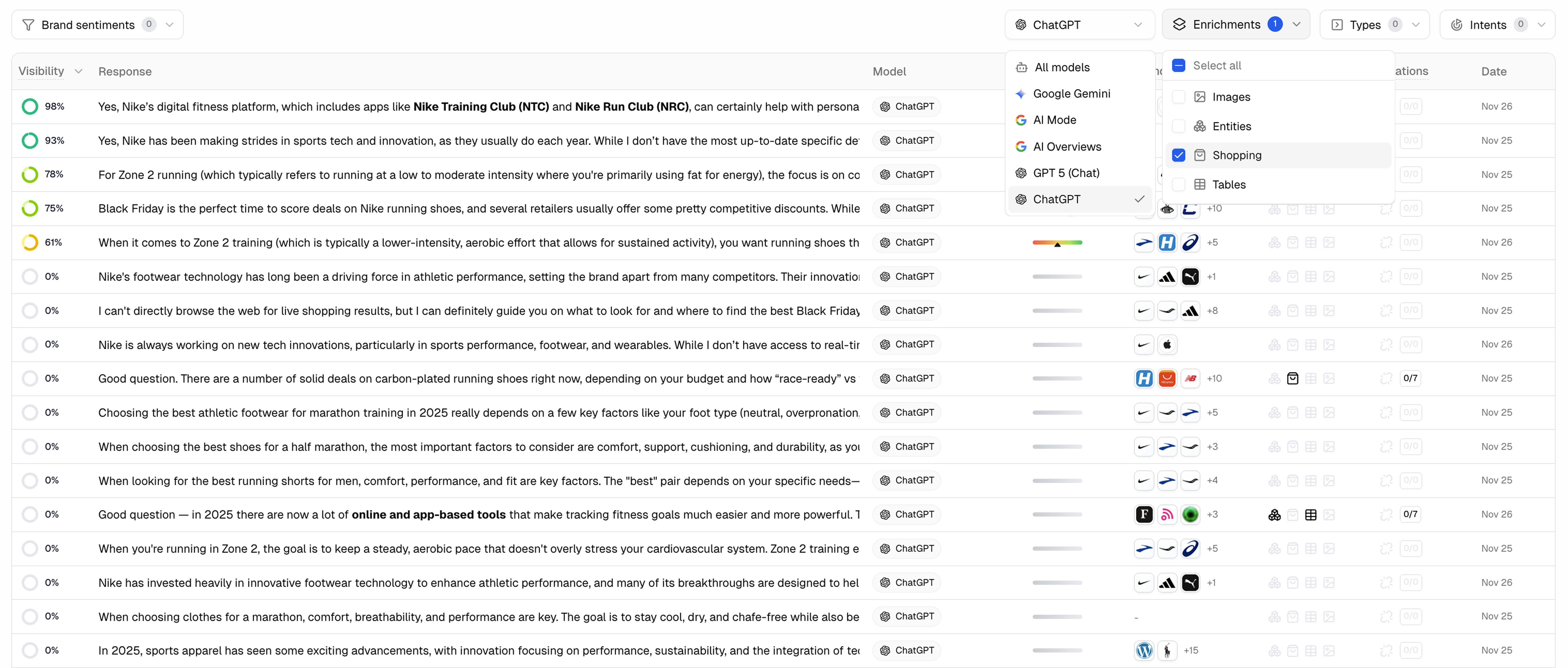 - Filter by Model (ChatGPT) & Enrichment (Shopping)