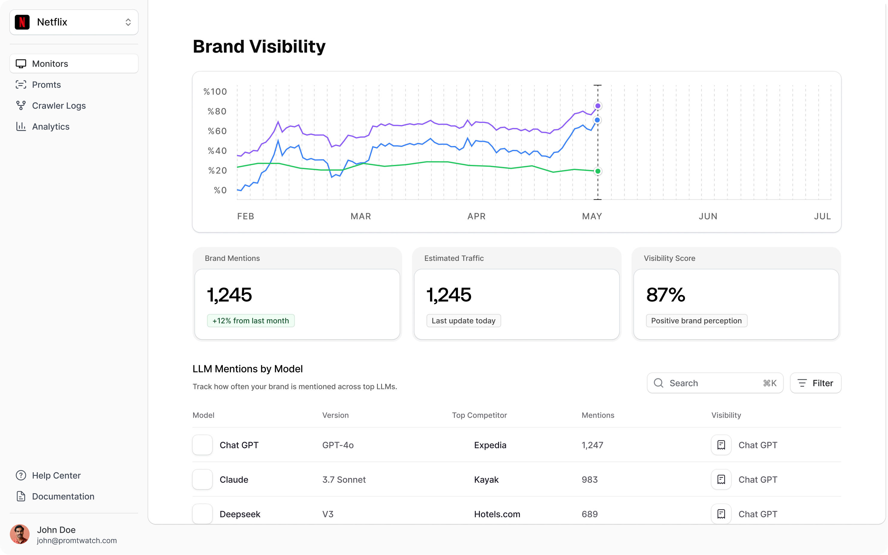 When your Brand Visibility Score is plotted against competitors, the distance between them represents a share of AI visibility. Closing that gap is your roadmap to growth.