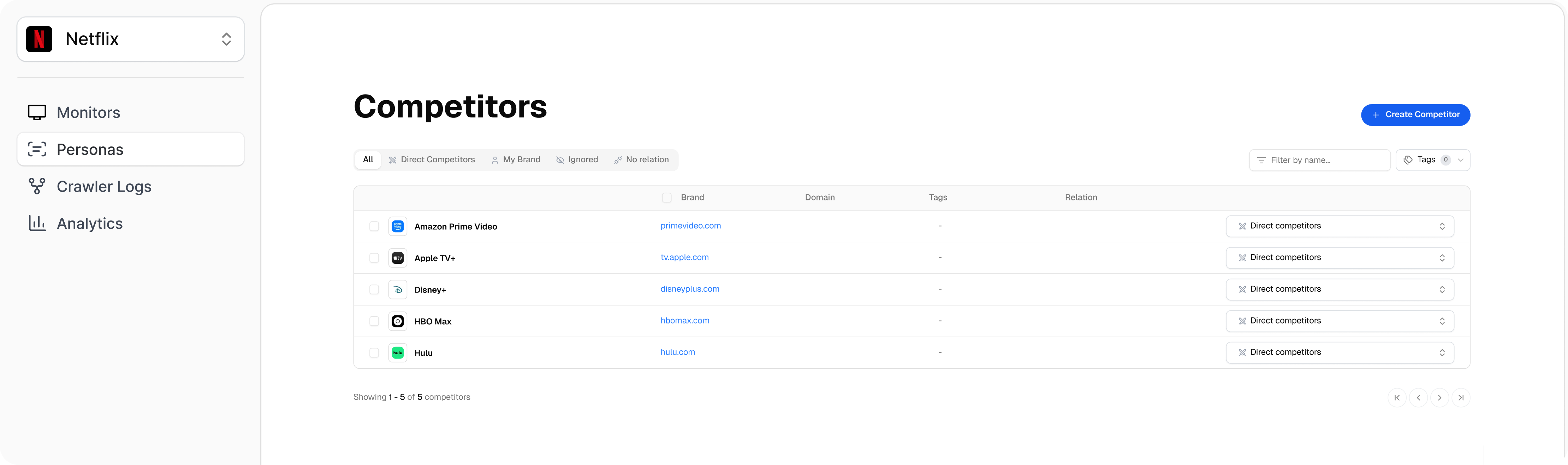 Tip: Don’t chase every competitor. Focus on the 2–3 whose content overlaps most with your monitored prompts, they define the real battle for AI visibility in your space.