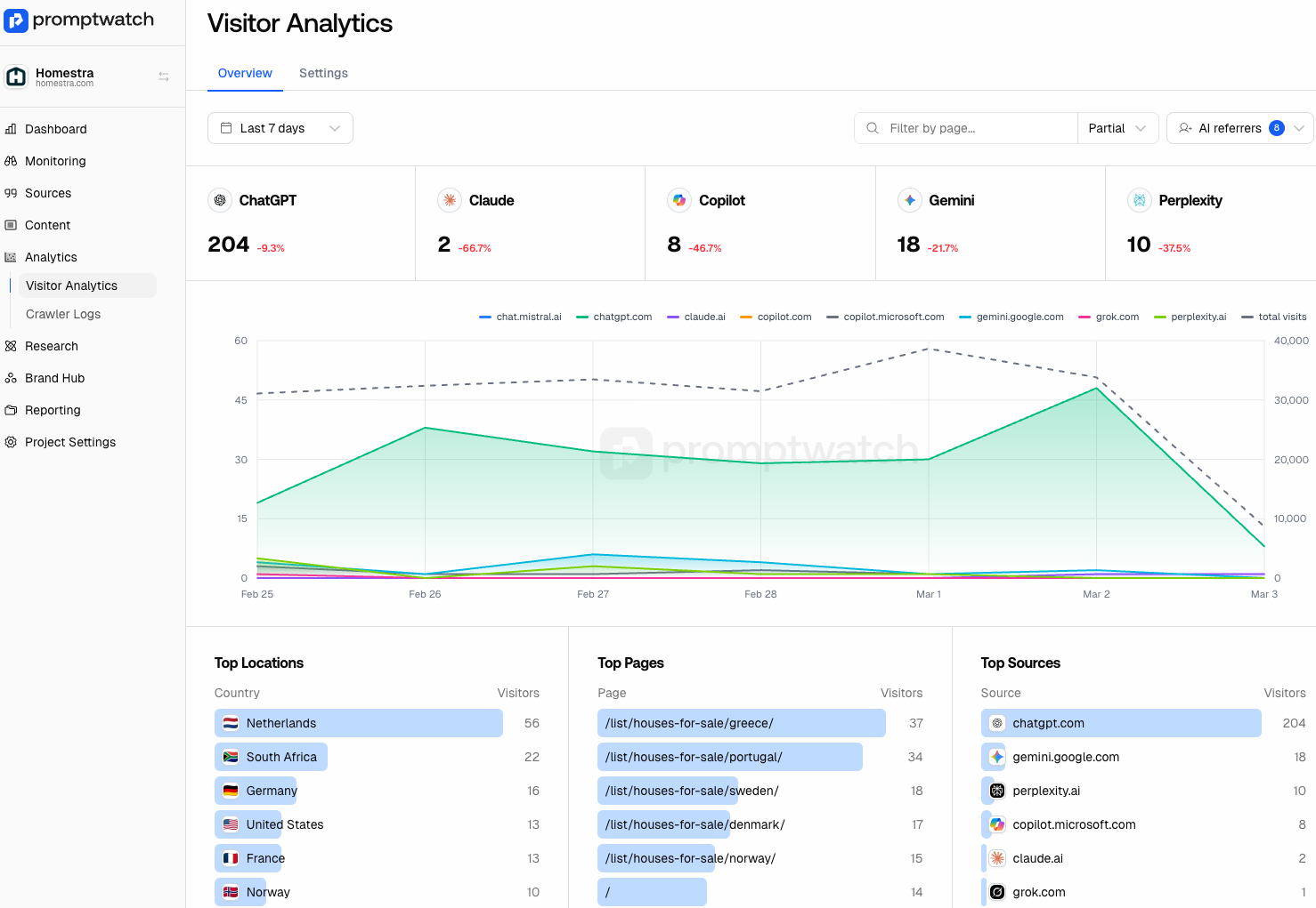 - Top Sources: The AI models and platforms referring traffic.