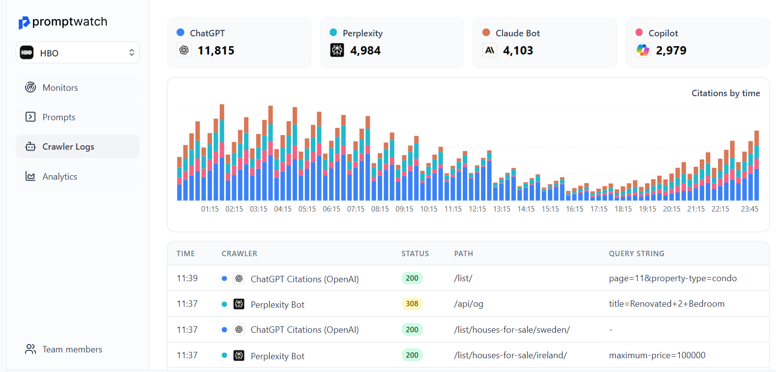 - Real-time brand monitoring: Tracks when and how your brand and content are cited across AI platforms.