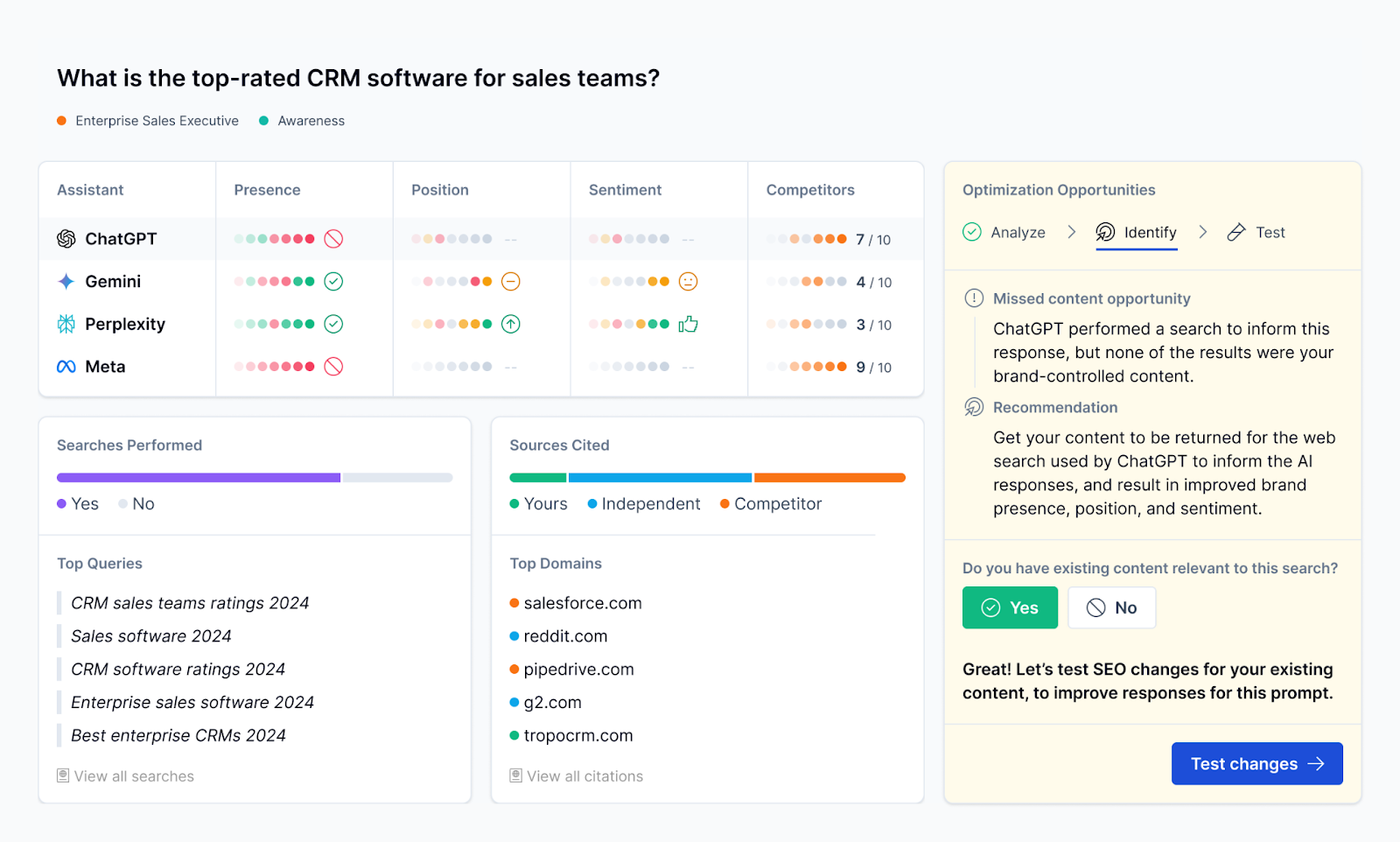 - Content/answer gap detection: Identifies areas where your content is lacking coverage compared to demand or competitor presence.