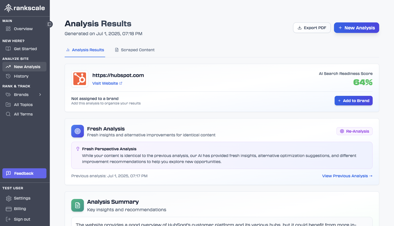 - Provides detailed analytics and recommendations to improve AI search performance.
