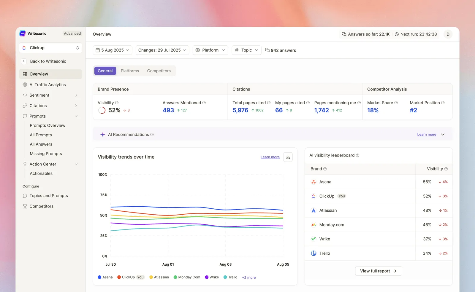 - Competitor benchmarking: Compares your brand's AI visibility score against competitors in AI-generated content.