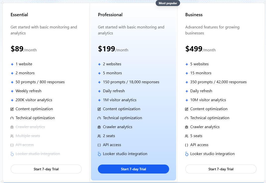- Professional – $199/month (most popular): For 2 sites, 5 monitors, 150 prompts, 1M visitor analytics, 15 generated articles, and advanced features like API access and Looker Studio.