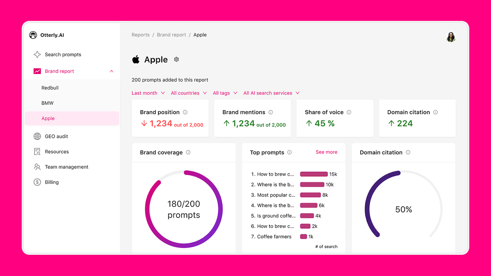 - Custom reporting & auditing tools: Offers page audits, prompt UI filtering, domain‑level analytics, and more.