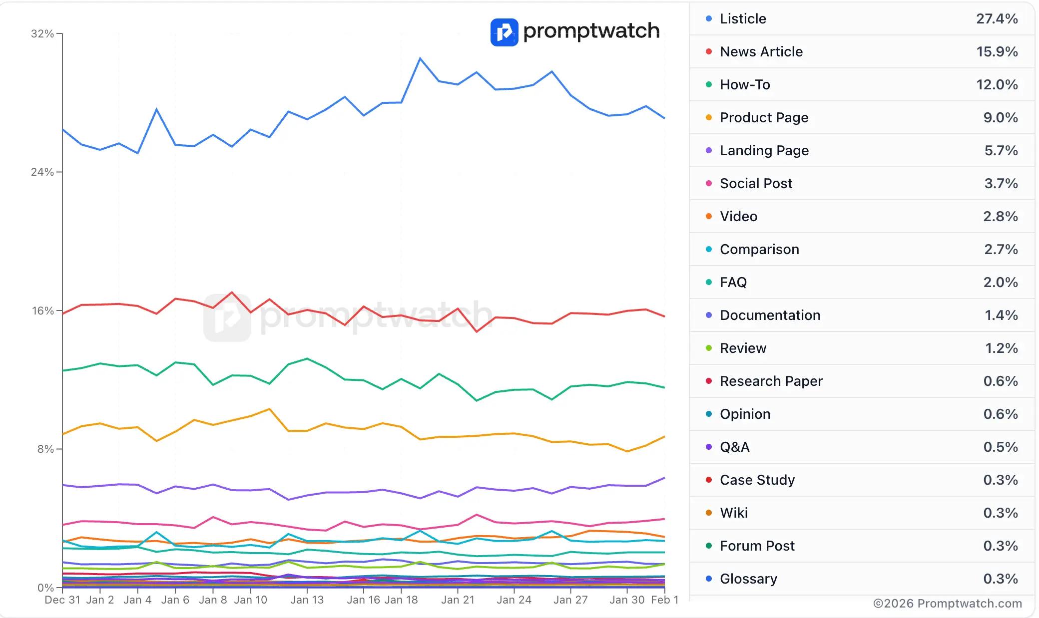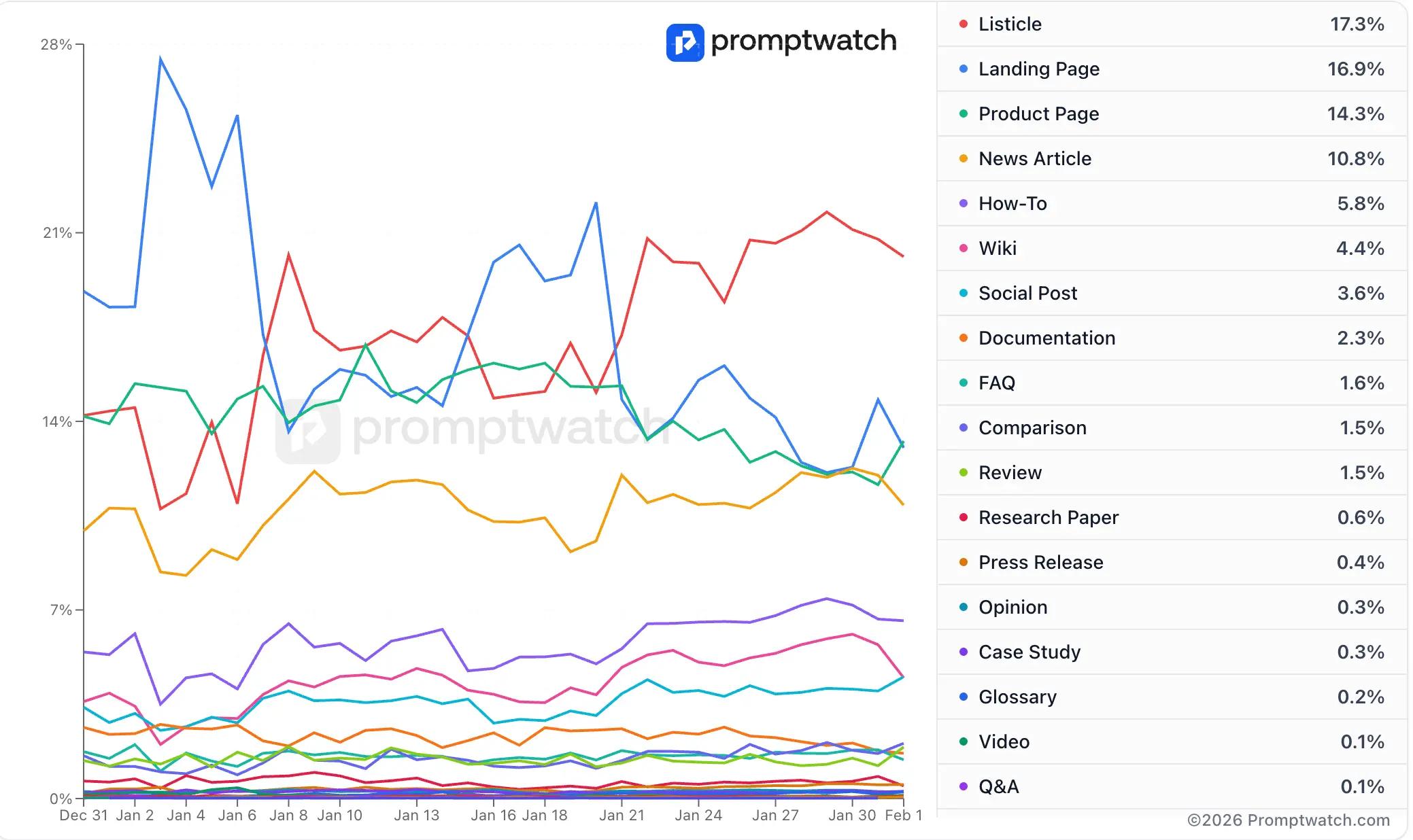 Before deciding what to create, it helps to know what AI is already pulling from. To understand which content formats AI actually cites, we analyzed 978,604 ChatGPT citations and classified each one by content type. Here is what our data shows: