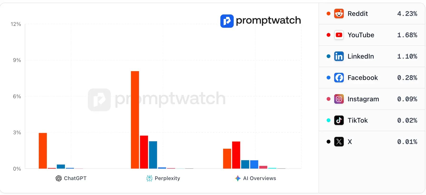 Reddit accounts for 4.1– 4.2% of all ChatGPT citations in our data, making it the #1 cited social platform, more than double YouTube, and four times LinkedIn.