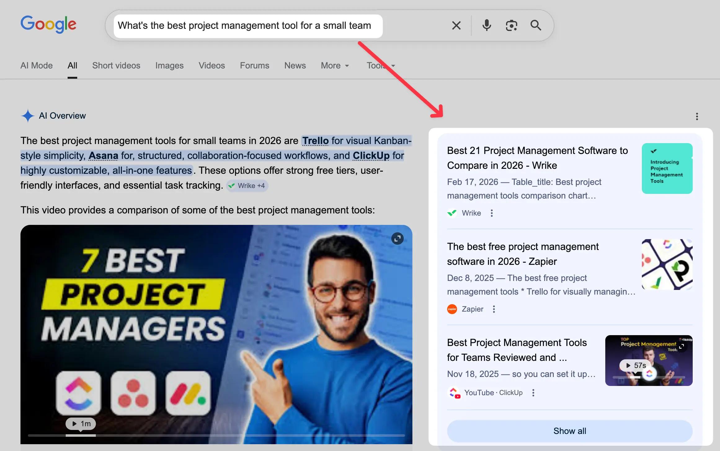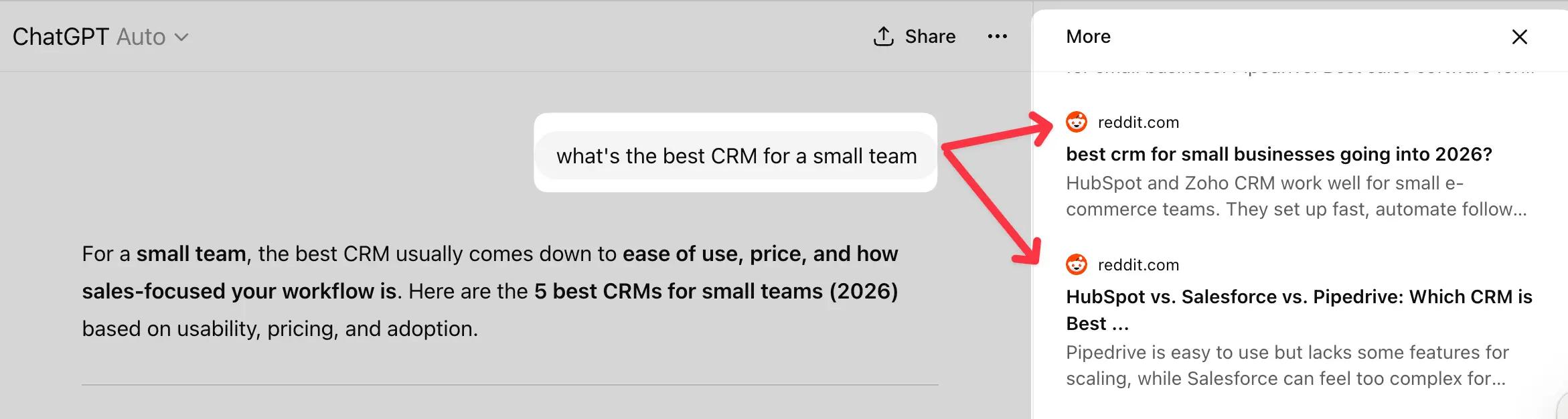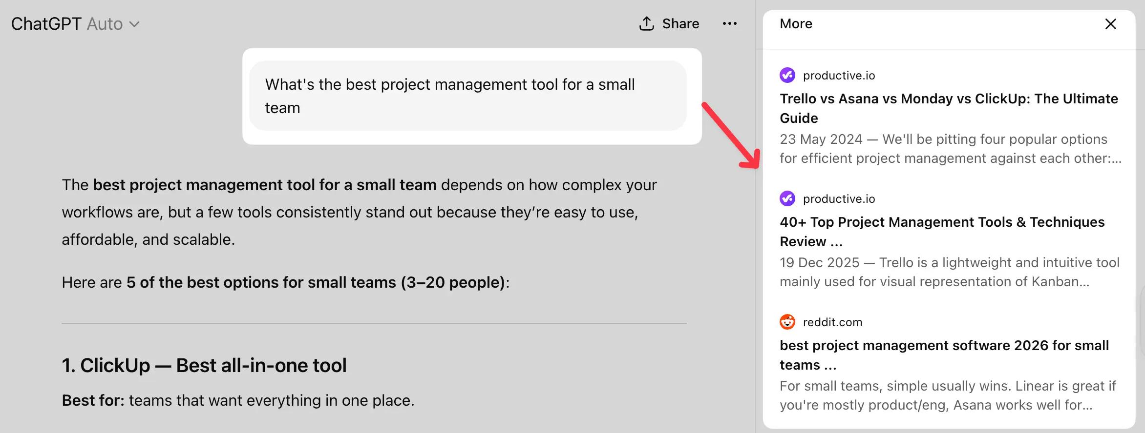 For example, if you ask ChatGPT, "What's the best project management tool for a small team?" the response might look something like this: