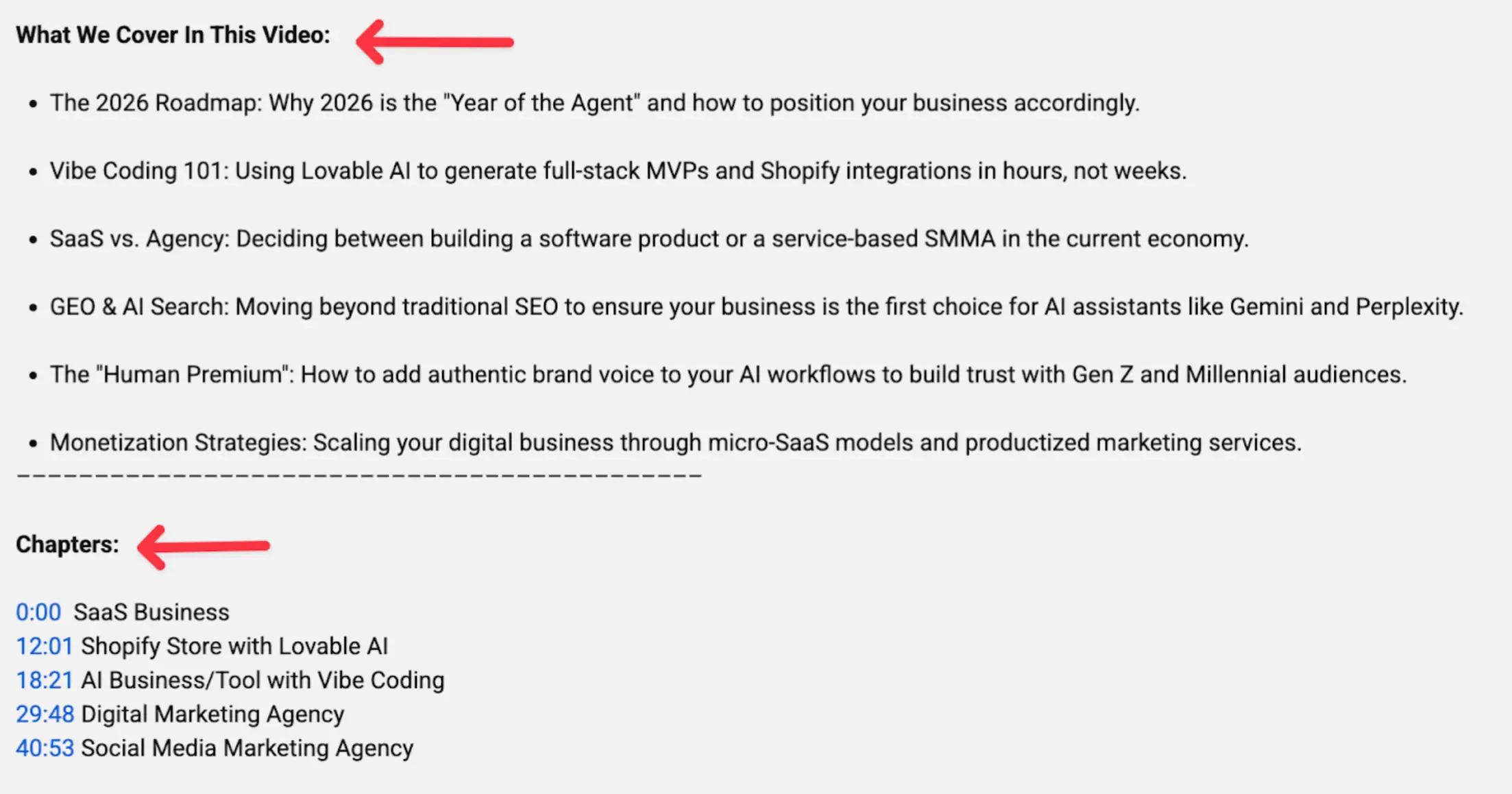 The chapter timestamps break the content into specific topics, making it easy for AI to identify exactly what each section covers and cite the relevant part for a specific query.