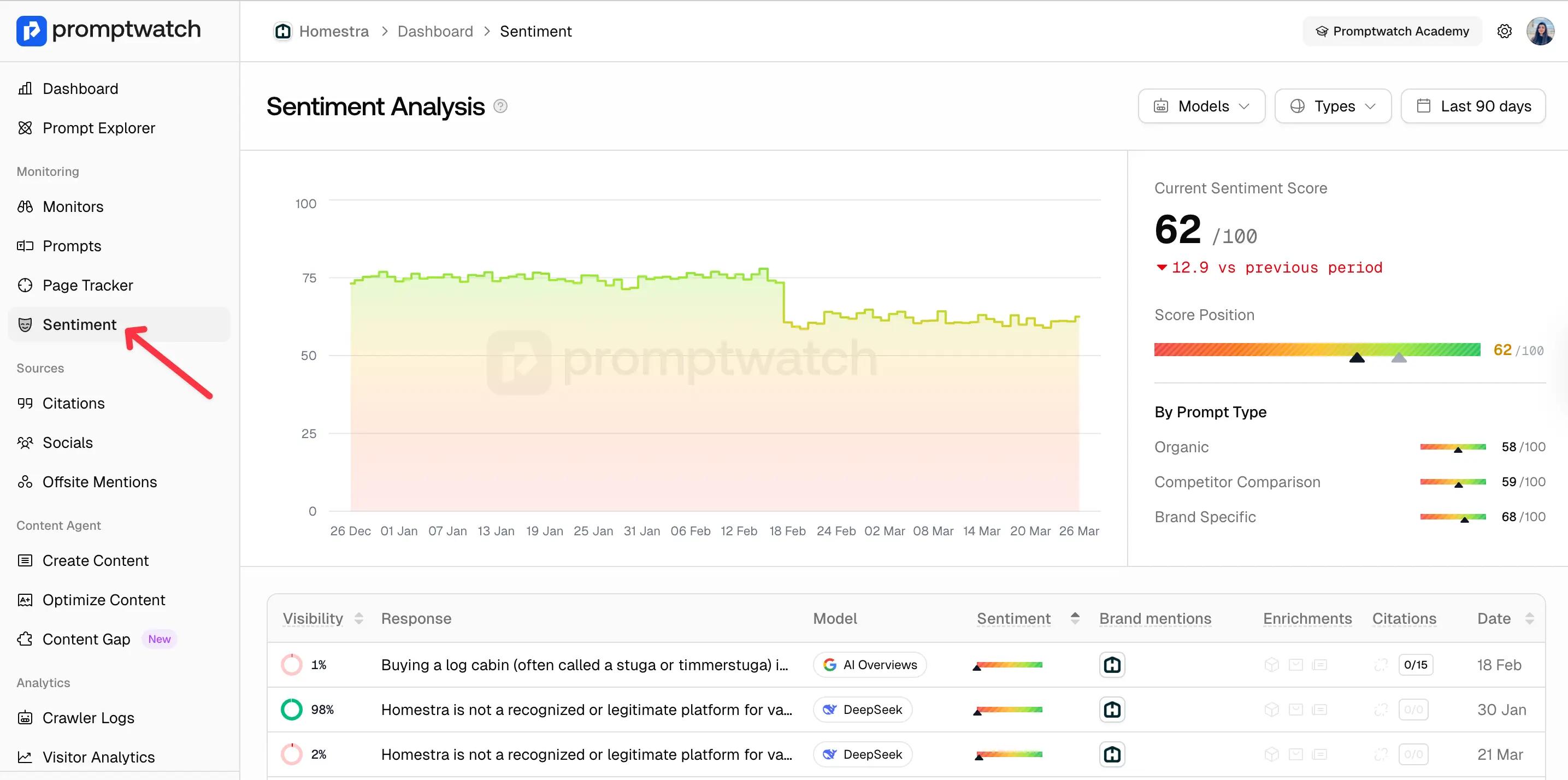 Beyond visibility, Promptwatch also tracks sentiment, not just whether AI mentions your brand, but how it actually talks about you, broken down by prompt type: organic queries, competitor comparisons, and brand-specific searches.