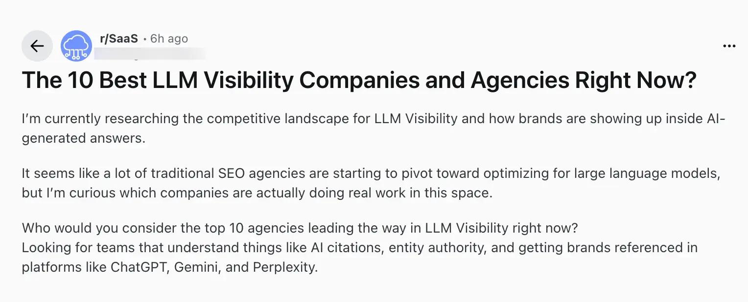 What's interesting is that this presence compounds over time. Our data shows a significant share of cited Reddit posts are over a year old. A thread from two years ago in r/SaaS where someone recommends your product is still being read and cited today.