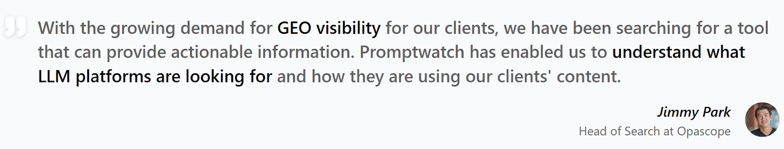 Promptwatch is trusted by over 1,500 brands like Opascope and Goochem Media to track real-time mentions across major LLMs like ChatGPT, Perplexity, Gemini etc. With multilingual monitoring and real-time insights, we help teams optimize AI visibility. This hands-on experience gives us the expertise to recommend the most effective LLM tools for boosting brand presence in AI search.