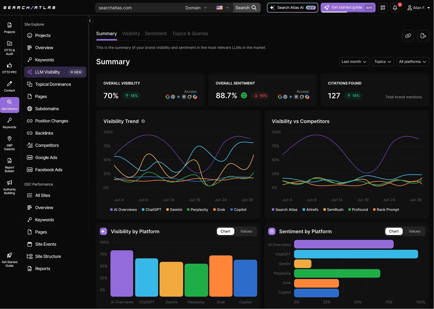 Search Atlas is an AI-powered SEO + LLM visibility platform that helps brands see their presence inside AI-generated answers across models like ChatGPT, Gemini, and Perplexity. It also offers SEO automation, content optimization, and site audits all within one dashboard.